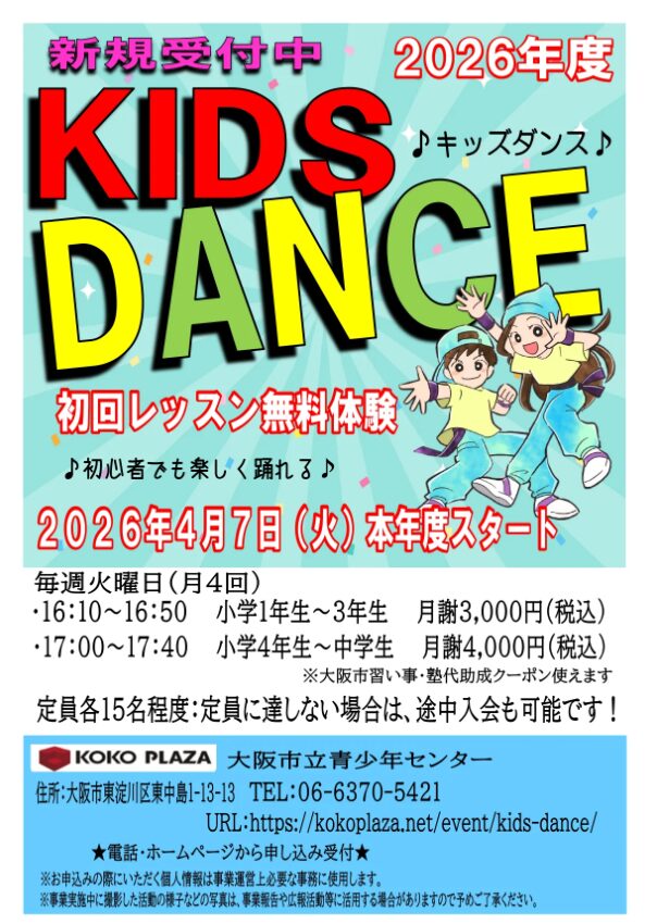 新大阪駅近くでキッズダンスを習いませんか?ダンスは、バランス感覚や柔軟性、リズム感や表現力の育成、協調性や社会性の向上、自己肯定感の向上が期待できます。健康的な身体づくりを目指しましょう!