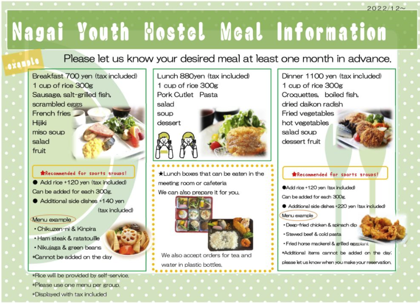 ※朝食・昼食・夕食は1名様にご飯は1合の提供です。ご飯の追加は200gごとに150円いただきます。