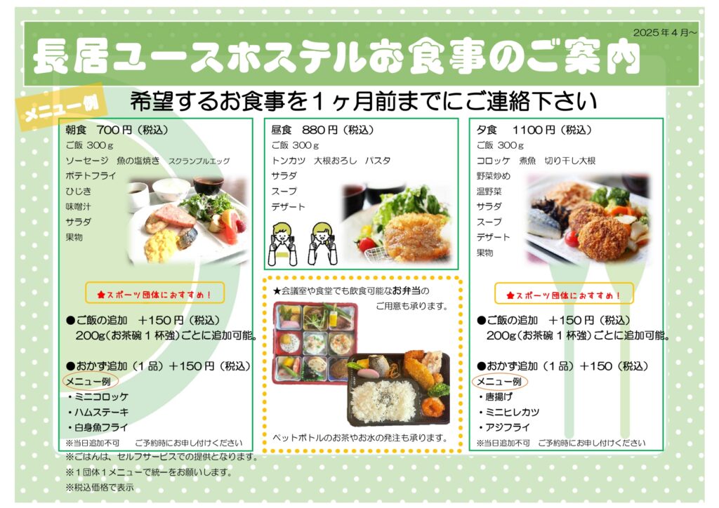 | 夕食 | 1,100円 +150円~おかず追加可能 |