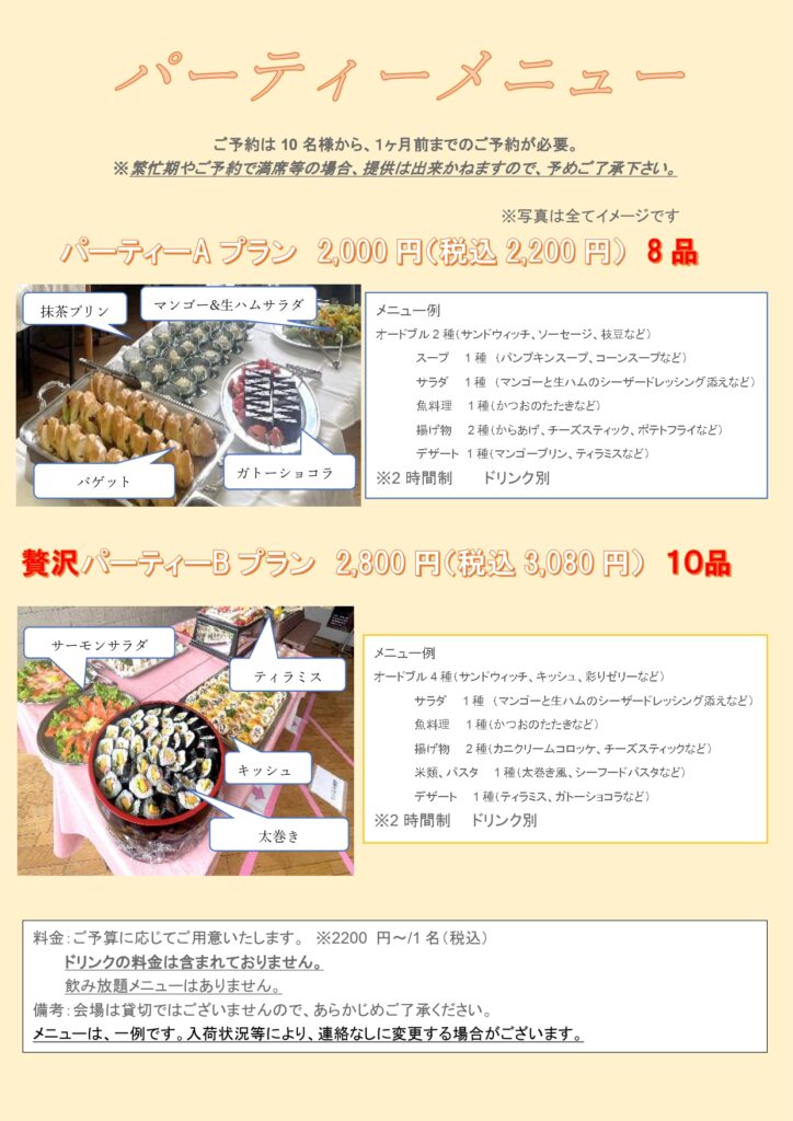 ※繁忙期など、パーティーメニューをお受けできない場合もございます。一度、ご相談ください。