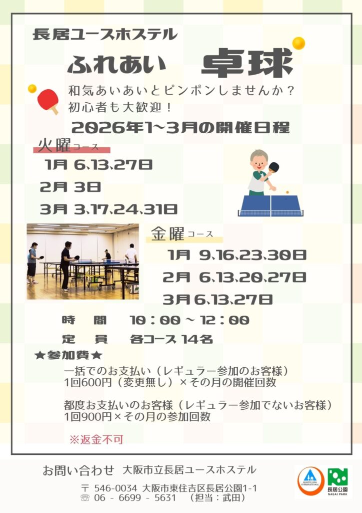 お申し込み 大阪市立長居ユースホステル 06-6699-5631 担当:武田